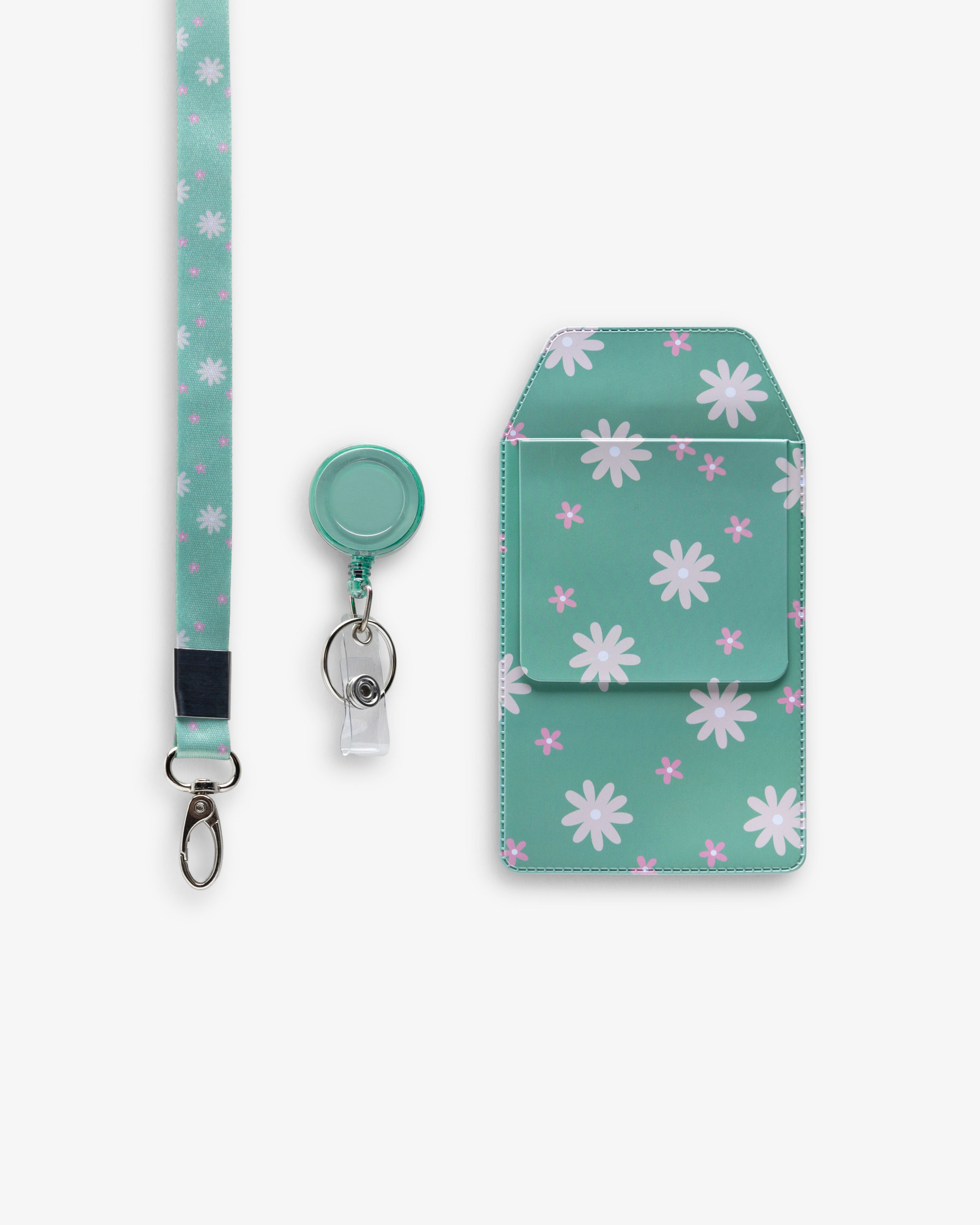 Fräscha upp din arbetsstil med vårt Arbetstillbehör Kit Blommor Mint. Denna kombination av blommigt mönster och en rund, grön jojo skapar en modern och pigg look. Mintgrönt är en färg som andas fräschör och lugn, perfekt för vårdmiljön. Kitet ser till att du har full kontroll på dina pennor, nycklar och kort, så att du kan fokusera på det som är viktigt.