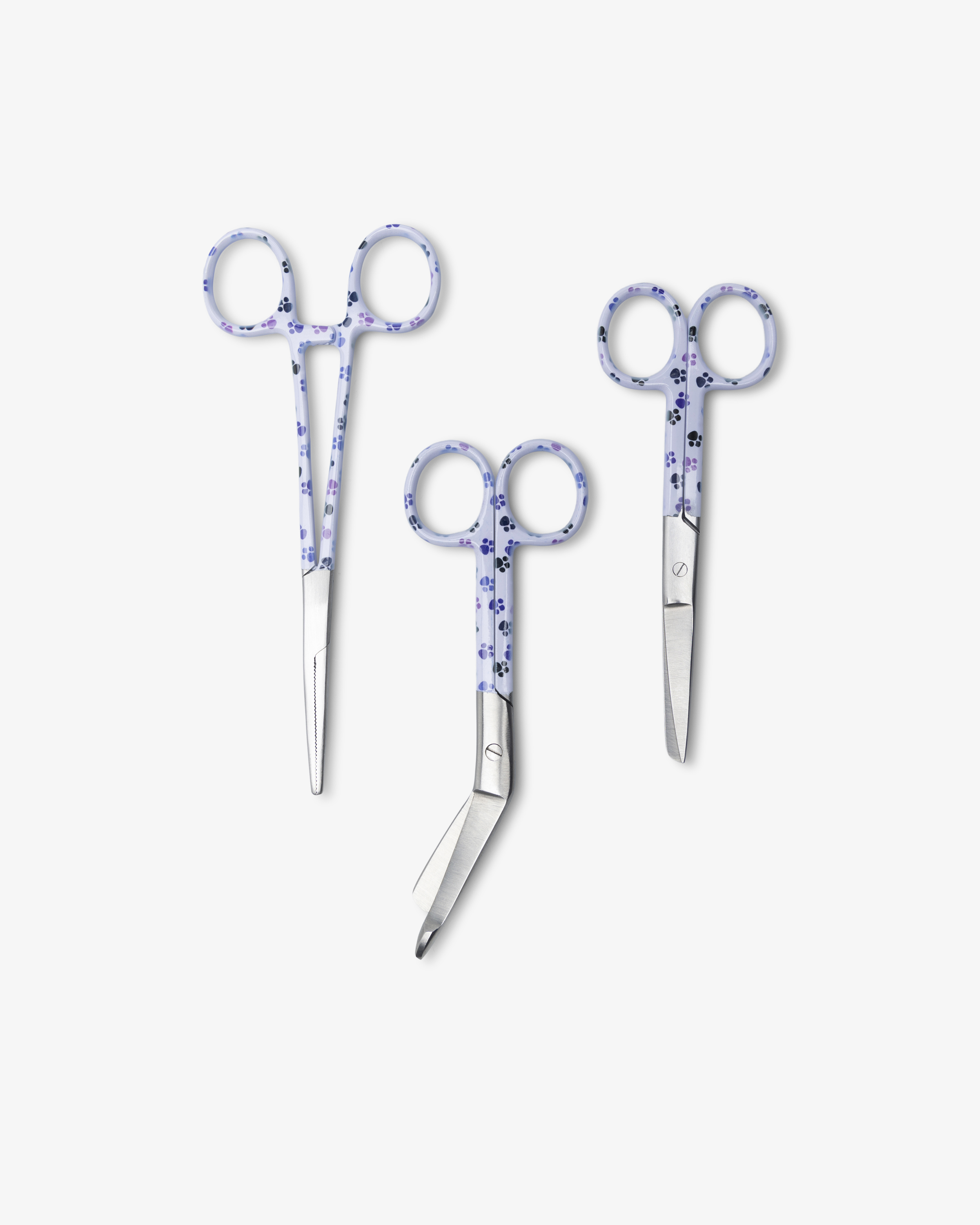 Gör arbetsdagen lite roligare med detta charmiga 3-pack i mönstret "Tassar". Setet är lämpligt för dig som arbetar inom veterinärvård eller med barn, men passar lika bra för alla djurvänner i vården. Verktygen är tillverkade i rostfritt stål av hög kvalitet med ett tryckt mönster. I paketet får du en kraftsax för att klippa i bandage och kläder, en peang för fixering, samt en detaljsax för mindre precisionsarbete.