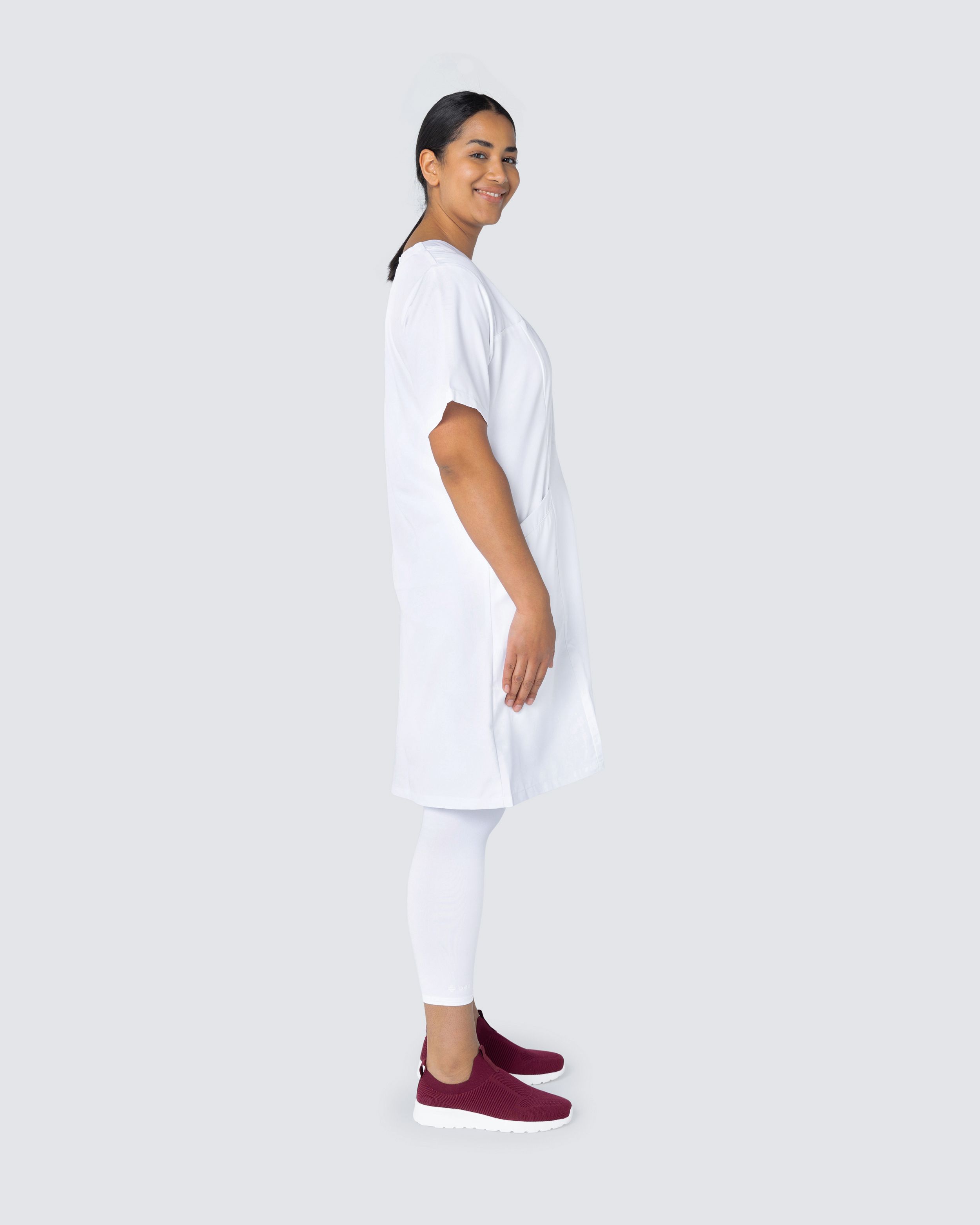 Skön vårdklänning i miljövänligt Tencel. Tencel är ett material som ger en lätt och skön känsla, andas bra och har en hög komfort - perfekt för dig i vården med långa och varma arbetspass. Arbetsklänningen har två rymliga sidfickor samt bröstficka. V-ringad hals och lätt figursydd ger fin passform.