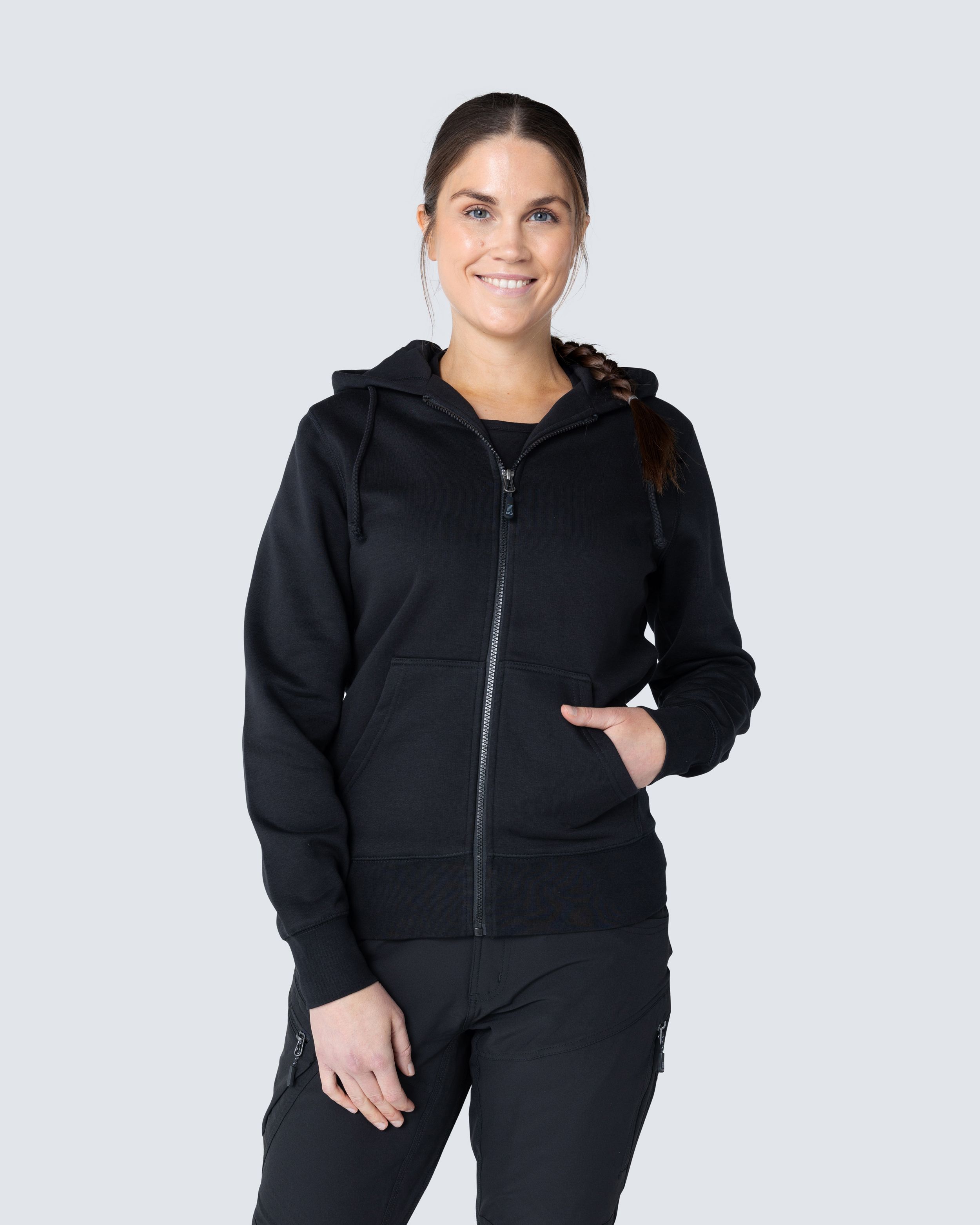 Collegejacka med fin dampassform. Dubbla tyglager i huvan och två frontfickor. Elastisk mudd i nederkant och vid ärmslut.